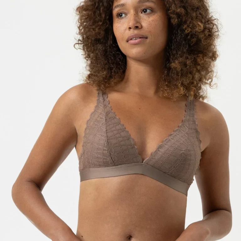 Confectionné dans une dentelle florale extensible, il enveloppe la poitrine d’une caresse légère. La forme triangle et l’absence d’armature offrent une liberté de mouvement totale, tout en conservant une belle tenue grâce à une doublure en tulle léger. L’effet est aérien, presque seconde peau, idéal pour les femmes à la recherche d’un soutien discret au quotidien.